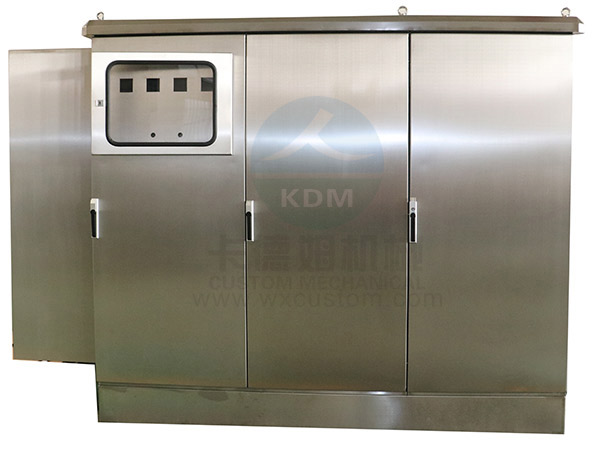 不銹鋼防雨柜(大型):是一款既要滿足客戶柜內空間最大化,又要保證戶外防水的一種柜型。材質一般以不銹鋼為主,防雨頂的設計既要美觀,又要保證與柜體間的防水性能。玻璃視窗的防水防塵性能也相當重要。